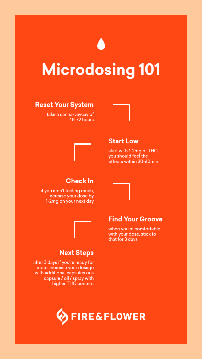 When you find your groove with how many milligrams of THC is comfortable for you, stick to that amount for at least 3 days. After the 3 days of microdosing this amount, if youâre feeling like you can handle more, go for it! Up the dosage of THC either by taking more microdose capsules or go for a capsule/oil/spray that has more THC content.Â